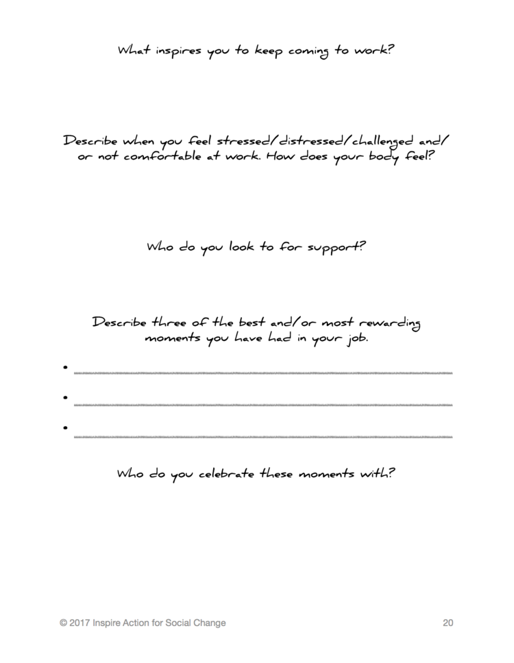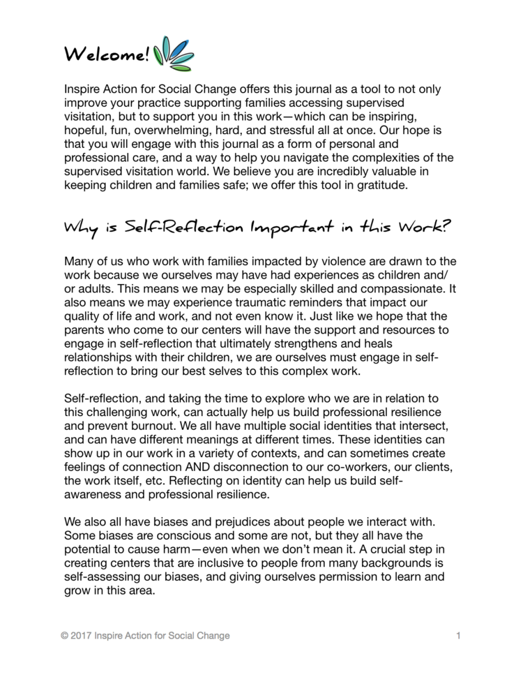 You work every day to keep women and children safe, and we know this work can be inspiring, hopeful, fun, overwhelming, hard, and stressful all at once. Inspire Action for Social Change offers this journal as a tool to not only improve your practice supporting families accessing supervised visitation, but to support you in this work. Self-reflection, and taking the time to explore who we are in relation to this challenging work, can actually help us build professional resilience and prevent burnout.